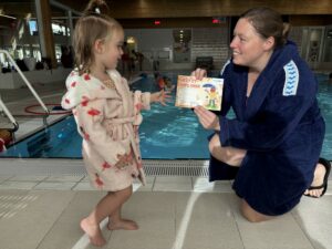Deze week lieten de kleine zwemmers die wekelijks oefenen zien wat zij al kunnen. Zij ontvingen een feestelijk diploma. Jaquelien: “Voor baby’s is het vooral genieten in warm water en de stroming ervaren. Peuters behaalden verschillende mijlpalen, zoals samen drijven met ondersteuning, onder water kijken of veilig van de kant springen. Het gaat om spelenderwijs vertrouwen krijgen in het water.”